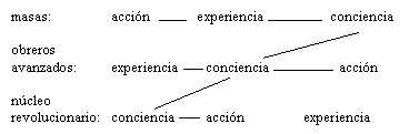 Por la forma en que están planteadas las cosas, es evidente que el punto de partida de esta discusión es una definición precisa de lo que es la vanguardia, qué papel cumple y cuáles son sus relaciones con el partido bolchevique. En el trabajo que citamos más arriba, [ 7 ] Mandel, adelantándose a las conclusiones del documento europeo, trató de dar una interpretación teórica sobre el nuevo papel del partido bolchevique y el de la vanguardia. En este cuadro que resume toda su concepción señala que hay tres segmentos fundamentales en la formación de la conciencia de clase: las masas, que avanzan de la acción a la experiencia y de allí a la conciencia; los obreros avanzados, de la experiencia a la conciencia y de la conciencia a la acción; y el núcleo revolucionario, de la conciencia a la acción y de allí a la experiencia: